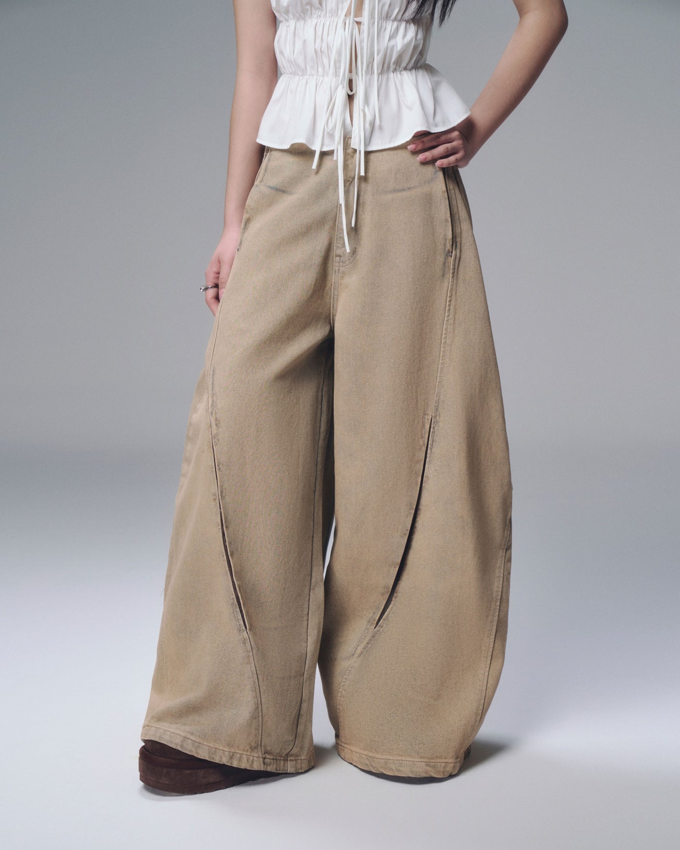 : Wide-leg pants with a low waist and a hem that covers the shoes. Features hidden zippers on both the front and back.