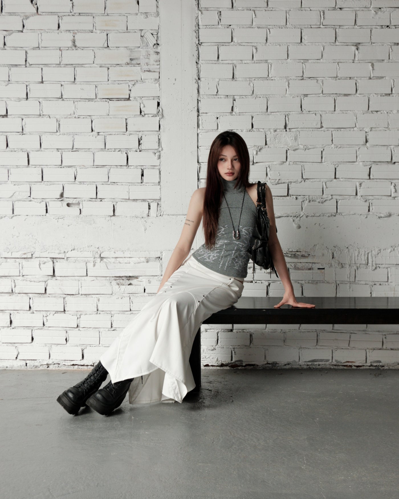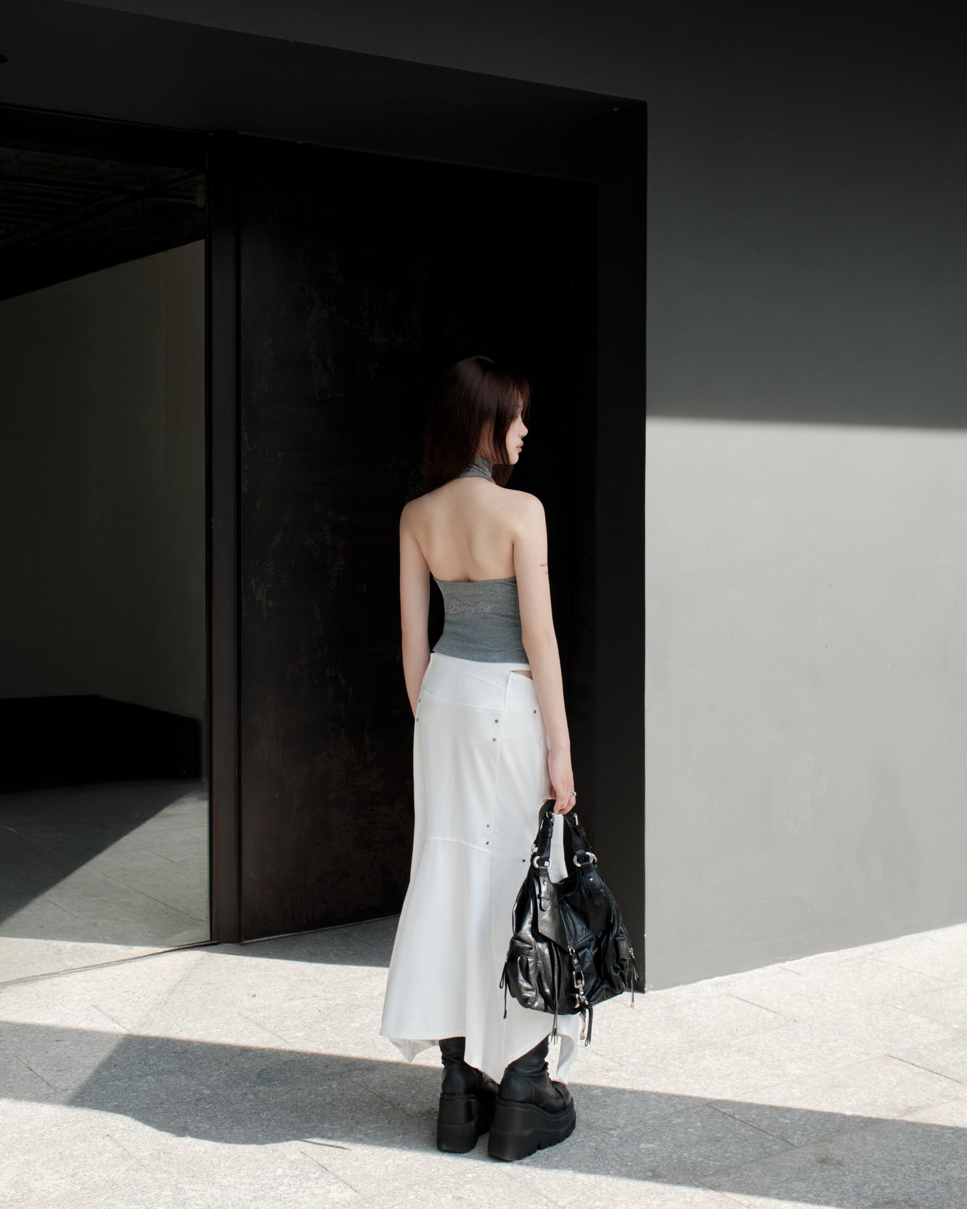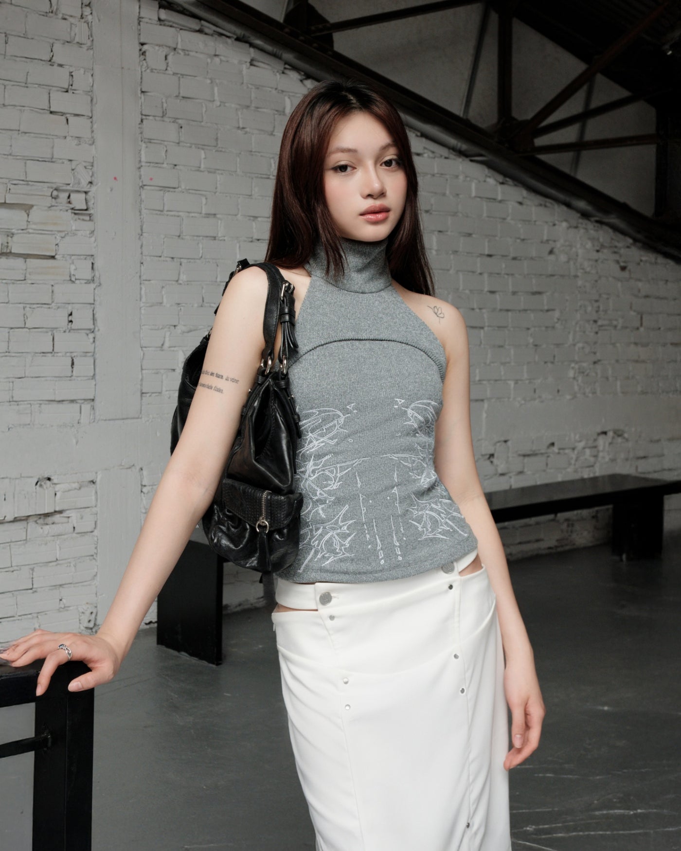 :High-neck backless tank top with embroidered detailing on the front. Fully lined for comfort.