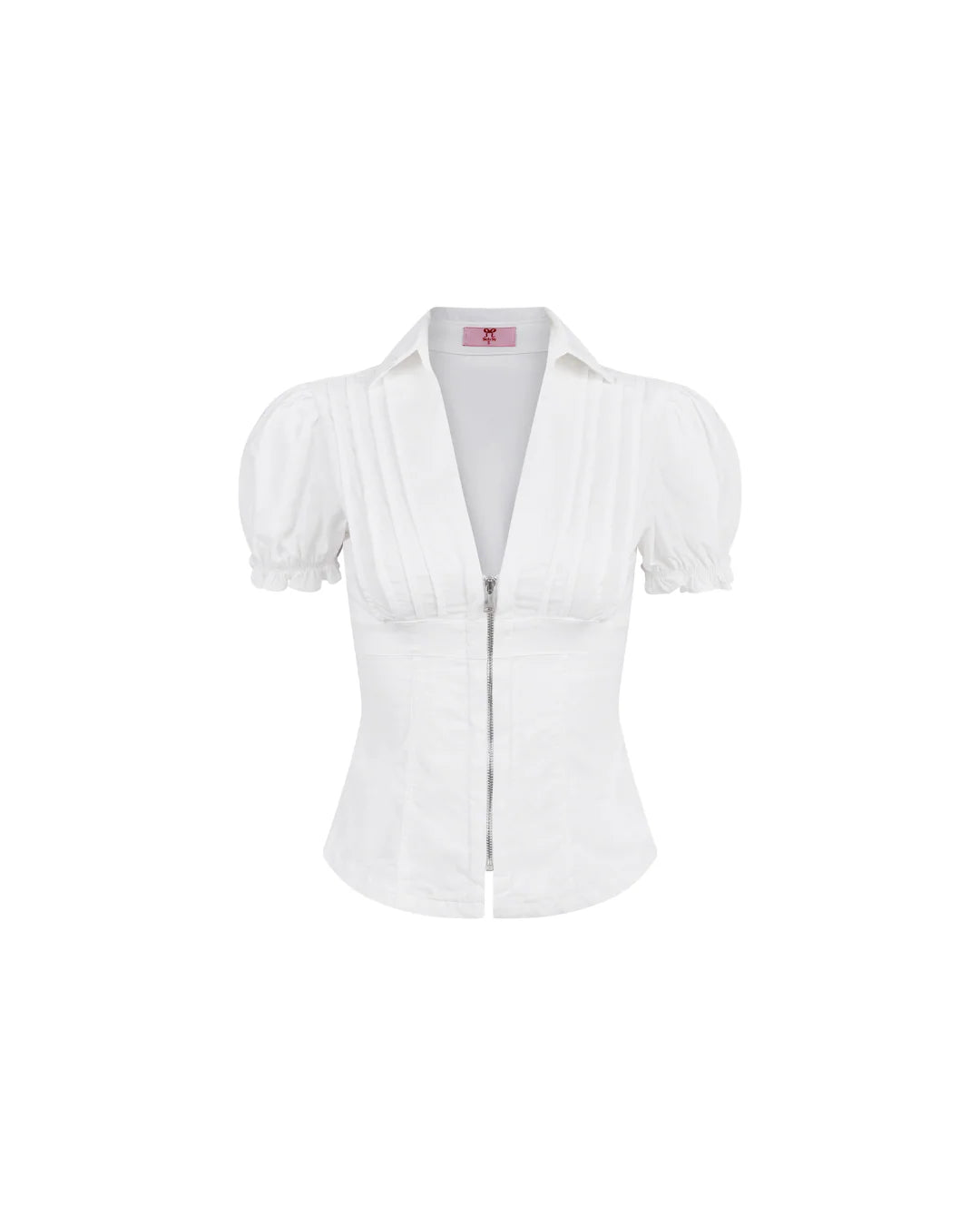 Short-sleeved blouse with a collared neckline and a zipper closure.